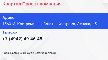 Квартал-Проект, компания по адресу 156013, Костромская область, Кострома, Ленина, 45 в дальнейшем Организация, размещена в следующих категориях: