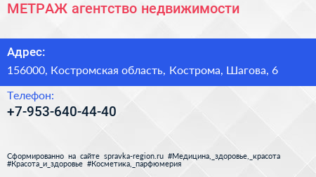 МЕТРАЖ, агентство недвижимости по адресу 156000, Костромская область, Кострома, Шагова, 6 в дальнейшем Организация, размещена в следующих категориях: