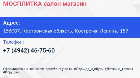 МОСПЛИТКА, салон-магазин по адресу 156007, Костромская область, Кострома, Ленина, 157 в дальнейшем Организация, размещена в следующих категориях: