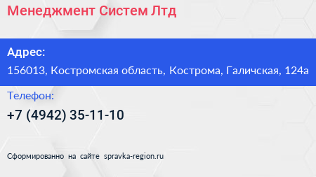 Менеджмент Систем Лтд по адресу 156013, Костромская область, Кострома, Галичская, 124а в дальнейшем Организация, размещена в следующих категориях: