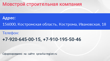 Мовстрой, строительная компания по адресу 156000, Костромская область, Кострома, Ивановская, 18 в дальнейшем Организация, размещена в следующих категориях: