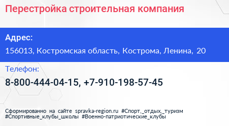 Перестройка, строительная компания по адресу 156013, Костромская область, Кострома, Ленина, 20 в дальнейшем Организация, размещена в следующих категориях: