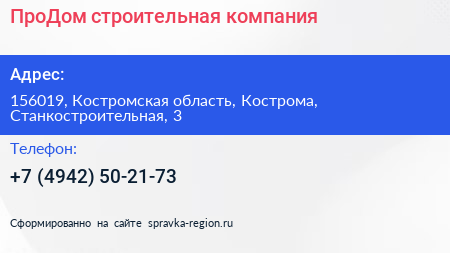 ПроДом, строительная компания по адресу 156019, Костромская область, Кострома, Станкостроительная, 3 в дальнейшем Организация, размещена в следующих категориях: