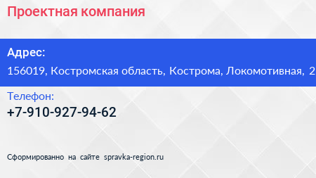 Проектная компания по адресу 156019, Костромская область, Кострома, Локомотивная, 2 в дальнейшем Организация, размещена в следующих категориях: