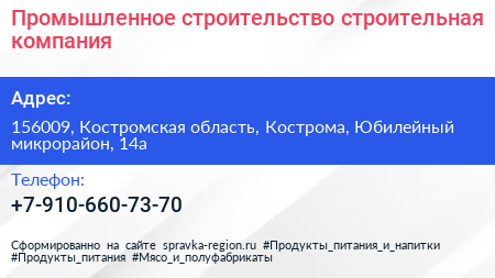 Промышленное строительство, строительная компания по адресу 156009, Костромская область, Кострома, Юбилейный микрорайон, 14а в дальнейшем Организация, размещена в следующих категориях: