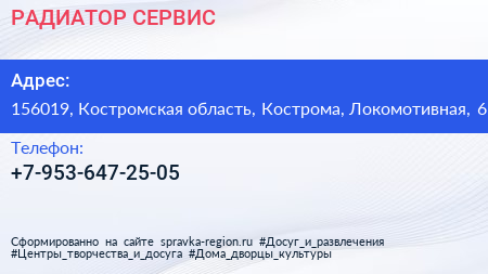 РАДИАТОР-СЕРВИС по адресу 156019, Костромская область, Кострома, Локомотивная, 6 в дальнейшем Организация, размещена в следующих категориях: