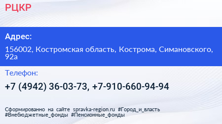 РЦКР по адресу 156002, Костромская область, Кострома, Симановского, 92а в дальнейшем Организация, размещена в следующих категориях: