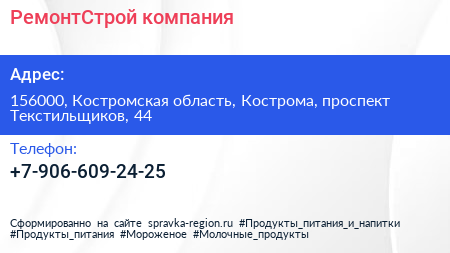 РемонтСтрой, компания по адресу 156000, Костромская область, Кострома, проспект Текстильщиков, 44 в дальнейшем Организация, размещена в следующих категориях: