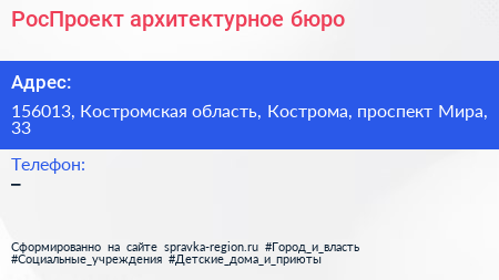 РосПроект, архитектурное бюро по адресу 156013, Костромская область, Кострома, проспект Мира, 33 в дальнейшем Организация, размещена в следующих категориях: