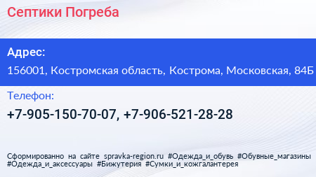 Септики & Погреба по адресу 156001, Костромская область, Кострома, Московская, 84Б в дальнейшем Организация, размещена в следующих категориях: