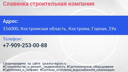 Славянка, строительная компания по адресу 156000, Костромская область, Кострома, Горная, 19а в дальнейшем Организация, размещена в следующих категориях: