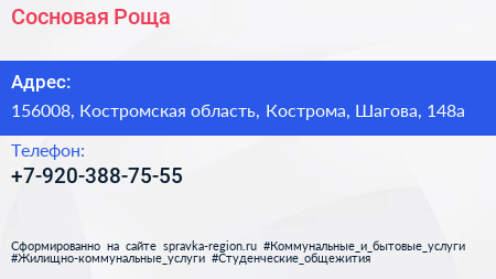 Сосновая Роща по адресу 156008, Костромская область, Кострома, Шагова, 148а в дальнейшем Организация, размещена в следующих категориях: