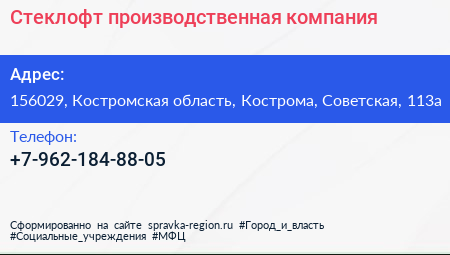 Стеклофт, производственная компания по адресу 156029, Костромская область, Кострома, Советская, 113а в дальнейшем Организация, размещена в следующих категориях: