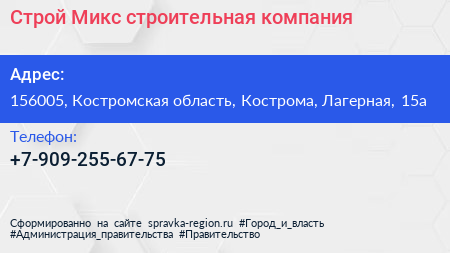 Строй Микс, строительная компания по адресу 156005, Костромская область, Кострома, Лагерная, 15а в дальнейшем Организация, размещена в следующих категориях: