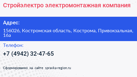 Стройэлектро, электромонтажная компания по адресу 156026, Костромская область, Кострома, Привокзальная, 16а в дальнейшем Организация, размещена в следующих категориях: