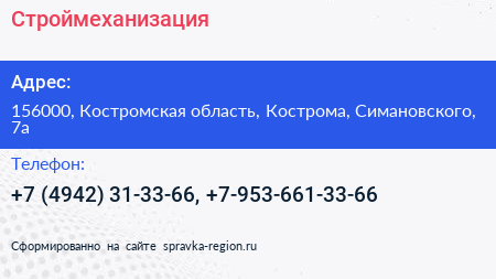Строймеханизация по адресу 156000, Костромская область, Кострома, Симановского, 7а в дальнейшем Организация, размещена в следующих категориях: