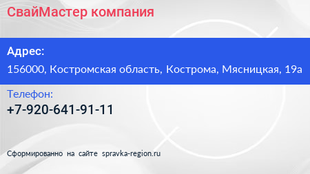 СвайМастер, компания по адресу 156000, Костромская область, Кострома, Мясницкая, 19а в дальнейшем Организация, размещена в следующих категориях: