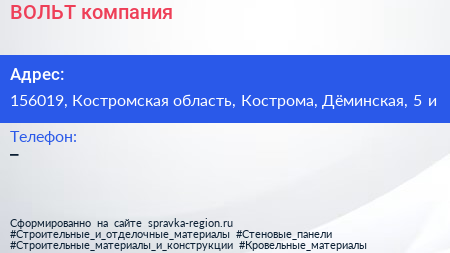 ВОЛЬТ, компания по адресу 156019, Костромская область, Кострома, Дёминская, 5 и в дальнейшем Организация, размещена в следующих категориях:
