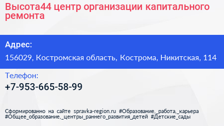 Высота44, центр организации капитального ремонта по адресу 156029, Костромская область, Кострома, Никитская, 114 в дальнейшем Организация, размещена в следующих категориях: