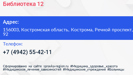 Библиотека №12 по адресу 156003, Костромская область, Кострома, Речной проспект, 92 в дальнейшем Организация, размещена в следующих категориях: