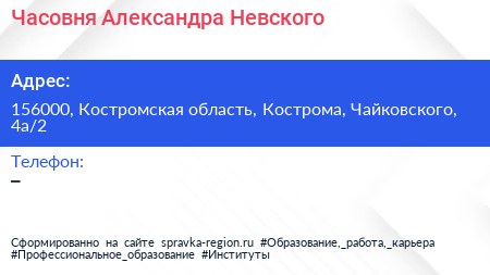 Часовня Александра Невского по адресу 156000, Костромская область, Кострома, Чайковского, 4а/2 в дальнейшем Организация, размещена в следующих категориях: