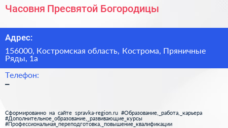 Часовня Пресвятой Богородицы по адресу 156000, Костромская область, Кострома, Пряничные Ряды, 1а в дальнейшем Организация, размещена в следующих категориях: