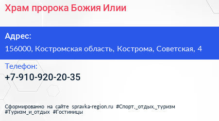 Храм пророка Божия Илии по адресу 156000, Костромская область, Кострома, Советская, 4 в дальнейшем Организация, размещена в следующих категориях: