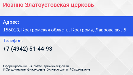 Иоанно-Златоустовская церковь по адресу 156013, Костромская область, Кострома, Лавровская, 5 в дальнейшем Организация, размещена в следующих категориях: