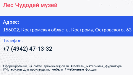 Лес-Чудодей, музей по адресу 156002, Костромская область, Кострома, Островского, 63 в дальнейшем Организация, размещена в следующих категориях: