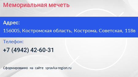 Мемориальная мечеть по адресу 156005, Костромская область, Кострома, Советская, 118в в дальнейшем Организация, размещена в следующих категориях: