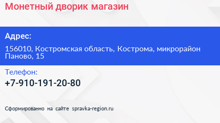 Монетный дворик, магазин по адресу 156010, Костромская область, Кострома, микрорайон Паново, 15 в дальнейшем Организация, размещена в следующих категориях: