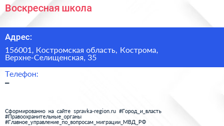 Воскресная школа по адресу 156001, Костромская область, Кострома, Верхне-Селищенская, 35 в дальнейшем Организация, размещена в следующих категориях: