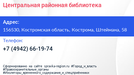 Центральная районная библиотека по адресу 156530, Костромская область, Кострома, Штеймана, 58 в дальнейшем Организация, размещена в следующих категориях: