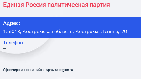 Единая Россия, политическая партия по адресу 156013, Костромская область, Кострома, Ленина, 20 в дальнейшем Организация, размещена в следующих категориях: