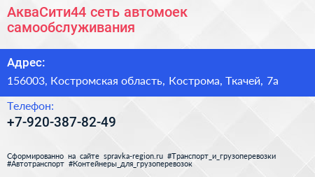 АкваСити44, сеть автомоек самообслуживания по адресу 156003, Костромская область, Кострома, Ткачей, 7а в дальнейшем Организация, размещена в следующих категориях: