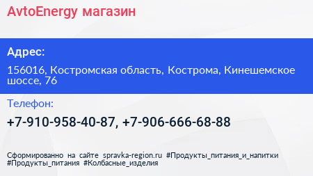 AvtoEnergy, магазин по адресу 156016, Костромская область, Кострома, Кинешемское шоссе, 76 в дальнейшем Организация, размещена в следующих категориях: