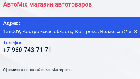 АвтоMix, магазин автотоваров по адресу 156009, Костромская область, Кострома, Волжская 2-я, 8 в дальнейшем Организация, размещена в следующих категориях: