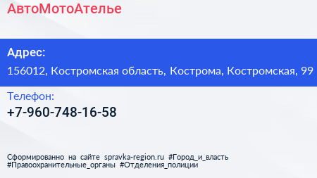 АвтоМотоАтелье по адресу 156012, Костромская область, Кострома, Костромская, 99 в дальнейшем Организация, размещена в следующих категориях: