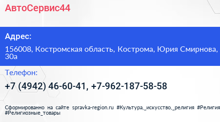АвтоСервис44 по адресу 156008, Костромская область, Кострома, Юрия Смирнова, 30а в дальнейшем Организация, размещена в следующих категориях: