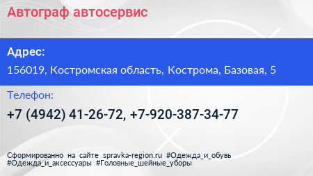 Автограф, автосервис по адресу 156019, Костромская область, Кострома, Базовая, 5 в дальнейшем Организация, размещена в следующих категориях: