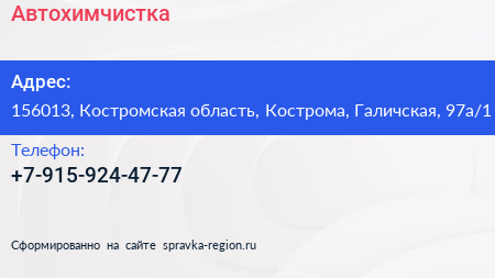 Автохимчистка по адресу 156013, Костромская область, Кострома, Галичская, 97а/1 в дальнейшем Организация, размещена в следующих категориях: