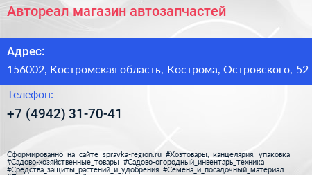 Автореал, магазин автозапчастей по адресу 156002, Костромская область, Кострома, Островского, 52 в дальнейшем Организация, размещена в следующих категориях: