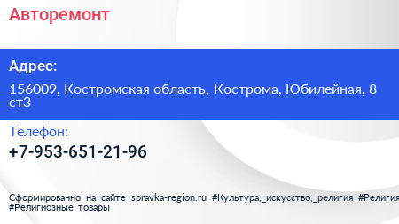 Авторемонт по адресу 156009, Костромская область, Кострома, Юбилейная, 8 ст3 в дальнейшем Организация, размещена в следующих категориях:
