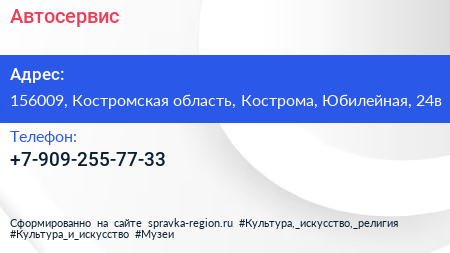 Автосервис по адресу 156009, Костромская область, Кострома, Юбилейная, 24в в дальнейшем Организация, размещена в следующих категориях: