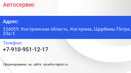Автосервис по адресу 156019, Костромская область, Кострома, Щербины Петра, 23а/1 в дальнейшем Организация, размещена в следующих категориях: