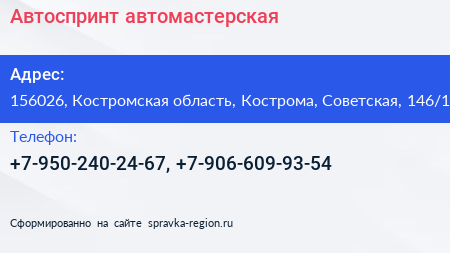 Автоспринт, автомастерская по адресу 156026, Костромская область, Кострома, Советская, 146/1 в дальнейшем Организация, размещена в следующих категориях:
