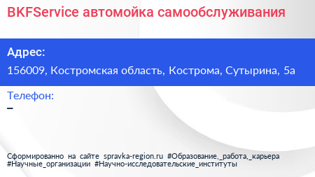 BKFService, автомойка самообслуживания по адресу 156009, Костромская область, Кострома, Сутырина, 5а в дальнейшем Организация, размещена в следующих категориях: