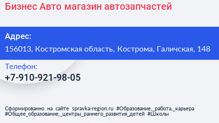 Бизнес Авто, магазин автозапчастей по адресу 156013, Костромская область, Кострома, Галичская, 148 в дальнейшем Организация, размещена в следующих категориях: