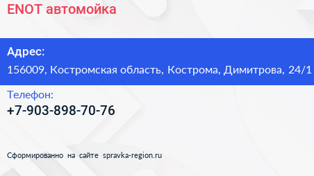 ENOT, автомойка по адресу 156009, Костромская область, Кострома, Димитрова, 24/1 в дальнейшем Организация, размещена в следующих категориях: