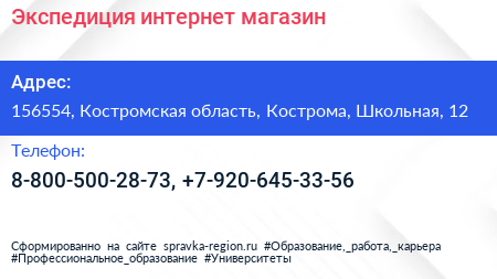 Экспедиция, интернет-магазин по адресу 156554, Костромская область, Кострома, Школьная, 12 в дальнейшем Организация, размещена в следующих категориях: